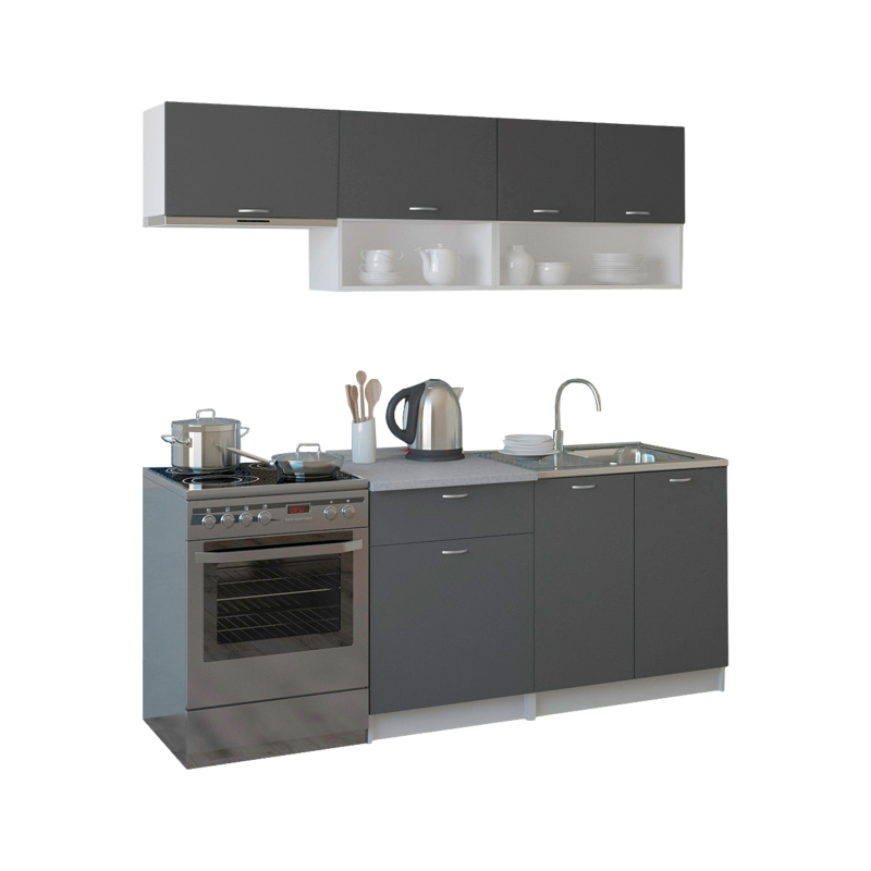 Σύνθεση Κουζίνας, σε απόχρωση γκρι - λευκό 200x46-29,2εκ.  Οι έτοιμες συνθέσεις κουζίνας καλύπτουν τις βασικές ανάγκες του χώρου σας, κυρίως αν χρειάζεστε μια μικρή κουζίνα με όλο τον απαραίτητο αποθηκευτικό χώρο.  Αν αναζητάτε μια οικονομική λύση, σε μικρή, ευθεία κουζίνα, κατασκευασμένη από εξαιρετικής ποιότητας μελαμίνη, πάχους 16mm, με ανοιχτούς και κλειστούς αποθηκευτικούς χώρους, ντουλάπια, συρτάρι, στα οποία μπορείτε να αποθηκεύσετε όλα τα είδη σερβιρίσματος, μαχαιροπήρουνα και τα σκεύη κουζίνας, τότε έχετε βρει το κατάλληλο προϊόν.  Το προϊόν αποτελεί μια ιδανική πρόταση για ενοικιαζόμενα δωμάτια, ξενοδοχεία, γραφεία, επαγγελματικούς χώρους και φοιτητικές ή εξοχικές κατοικίες.  Γενικές διαστάσεις επιτοίχιας μονάδας: 200x29,2x59,4Υ εκ. Ύψος ανοιχτών αποθηκευτικών χώρων: 22,8Υ εκ. Ύψος ντουλαπιών: 36,6Υ εκ.  Γενικές διαστάσεις επιδαπέδιας μονάδας: 140x46x84,6Υ εκ. Διαστάσεις διπλού ντουλαπιού: 80x46x71,8Υ εκ. Διαστάσεις μονού ντουλαπιού και συρταριέρας: 60x46x71,8Υ εκ. Διαστάσεις κενού χώρου για ηλεκτρική συσκευή: 60x60x84,6Υ εκ. Ύψος μπάζας: 10 εκ. Ο πάγκος του μονού ντουλαπιού συμπεριλαμβάνεται. Διαστάσεις πάγκου: 40x60x2,8 εκ.  Πάχος μελαμίνης: 16 mm. Ευρωπαϊκής προέλευσης και κατασκευής  * Δεν συμπεριλαμβάνονται οι ηλεκτρικές συσκευές, ο νεροχύτης και τα σκεύη κουζίνας. * Προτείνεται νεροχύτης επικαθήμενος 80x60 εκ. * Τα ντουλάπια έχουν την δυνατότητα να προσαρμοστούν σύμφωνα με τις ανάγκες του κάθε πελάτη.