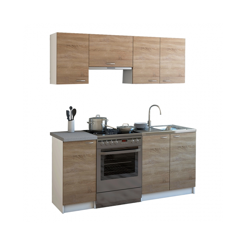 Σύνθεση Κουζίνας, σε απόχρωση sonama - λευκό 180x29,2-46 εκ. Οι έτοιμες συνθέσεις κουζίνας καλύπτουν τις βασικές ανάγκες του χώρου σας, κυρίως αν χρειάζεστε μια μικρή κουζίνα με όλο τον απαραίτητο αποθηκευτικό χώρο. Αν αναζητάτε μια οικονομική λύση, σε μικρή, ευθεία κουζίνα, κατασκευασμένη από εξαιρετικής ποιότητας μελαμίνη, πάχους 16mm, με κλειστούς αποθηκευτικούς χώρους, ντουλάπια, στα οποία μπορείτε να αποθηκεύσετε όλα τα είδη σερβιρίσματος και τα σκεύη κουζίνας, τότε έχετε βρει το κατάλληλο προϊόν. Το προϊόν αποτελεί μια ιδανική πρόταση για ενοικιαζόμενα δωμάτια, ξενοδοχεία, γραφεία, επαγγελματικούς χώρους και φοιτητικές ή εξοχικές κατοικίες. Γενικές διαστάσεις επιτοίχιας μονάδας: 180x29,2x59,4Υ εκ. Ύψος ντουλαπιών: 59,4Υ εκ. Γενικές διαστάσεις επιδαπέδιας μονάδας: 120x46x84,6Υ εκ. Διαστάσεις διπλού ντουλαπιού: 80x 46x71,8Υ εκ. Διαστάσεις μονού ντουλαπιού: 40x46x71,8Υ εκ. Διαστάσεις κενού χώρου για ηλεκτρική συσκευή: 60x60x84,6Υ Ύψος μπάζας: 10 εκ. Ο πάγκος του μονού ντουλαπιού συμπεριλαμβάνεται. Διαστάσεις πάγκου: 40x60x2,8 εκ. Πάχος μελαμίνης: 16 mm. Ευρωπαϊκής προέλευσης και κατασκευής * Δεν συμπεριλαμβάνονται οι ηλεκτρικές συσκευές, ο νεροχύτης και τα σκεύη κουζίνας. * Προτείνεται νεροχύτης επικαθήμενος 80x60 εκ. * Τα ντουλάπια έχουν την δυνατότητα να προσαρμοστούν σύμφωνα με τις ανάγκες του κάθε πελάτη.