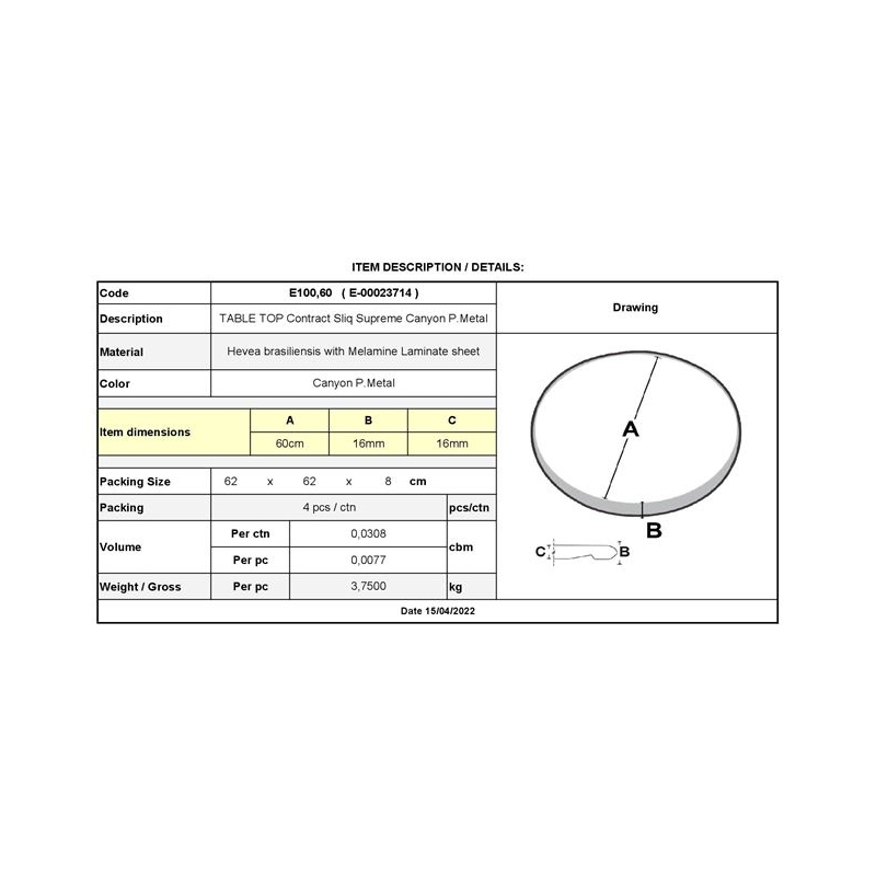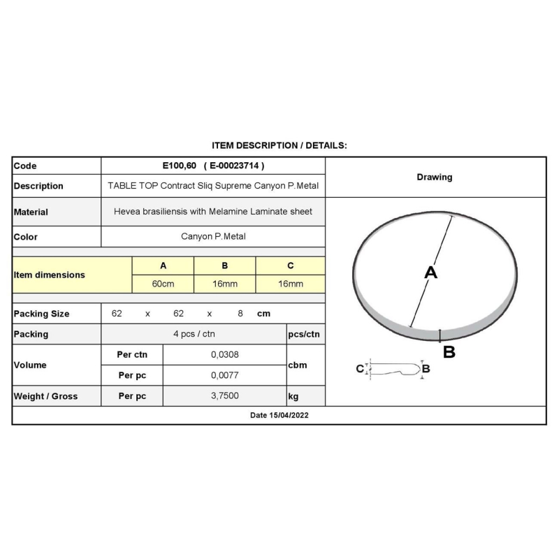 Contract Sliq Smooth Supreme Επιφάνεια Τραπεζιού τ.Werzalit Απόχρωση Canyon P.Metal Φ60cm/16mm