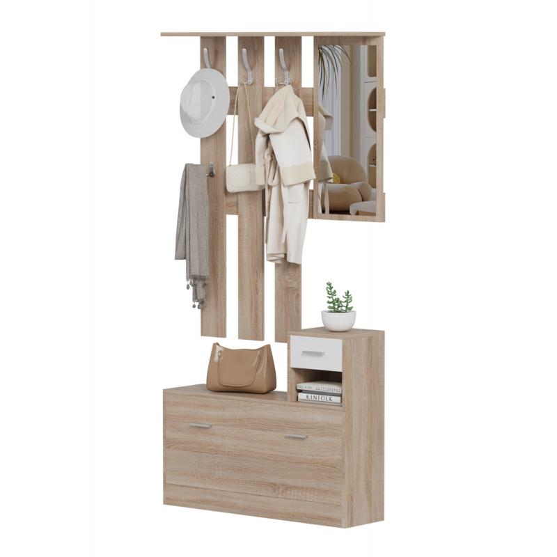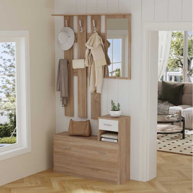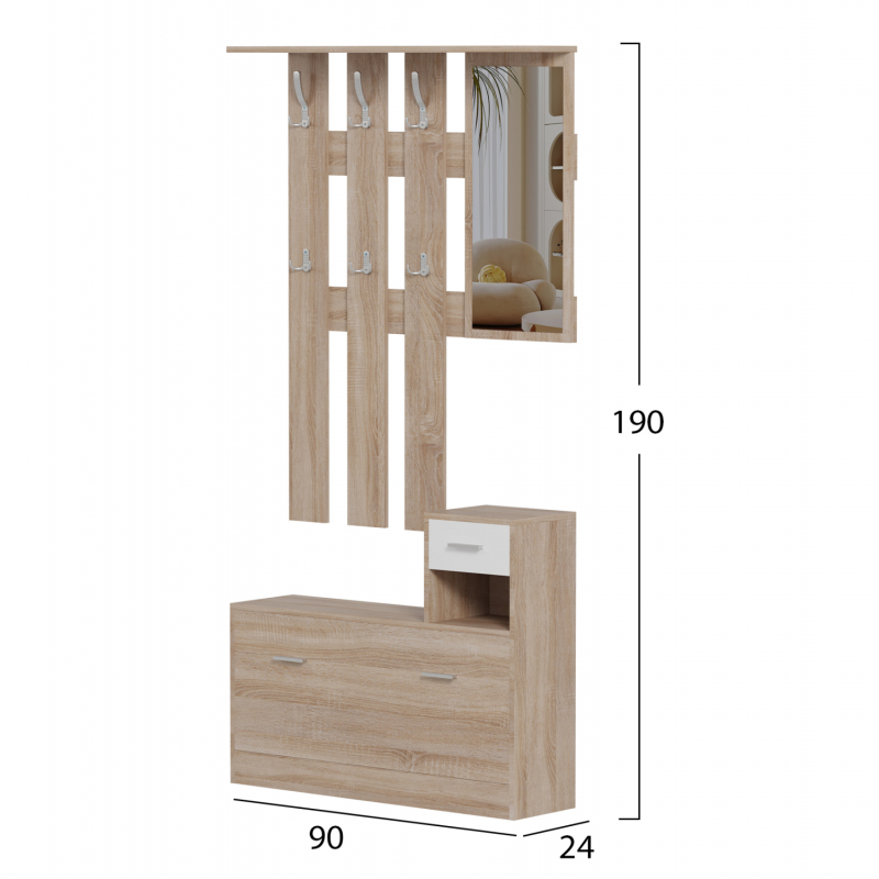 Το έπιπλο εισόδου GORN αποτελείται από μια παπουτσοθήκη-ντουλάπι με δύο πόρτες και έναν μικρό ανοιχτό αποθηκευτικό χώρο κι ένα συρτάρι. Επάνω από την παπουτσοθήκη και αναρτημένη στον τοίχο είναι μια κατασκευή με κρεμάστρες ως βεστιάριο και ένας καθρέπτης, ενώ υπάρχει και ένα ράφι τέρμα επάνω. Ένα σετ μελαμίνης σε χρώμα SONAMA-ΛΕΥΚΟ που θα σας ενθουσιάσει με την πρακτικότητα του. ΔΙΑΣΤΑΣΕΙΣ: 90x24x190Υ εκ. ΥΛΙΚΑ ΚΑΤΑΣΚΕΥΗΣ: Το σετ εισόδου είναι κατασκευασμένο από μελαμίνη πάχους 15/12mm. Η μελαμίνη είναι είδος ξύλου σε μορφή μοριοσανίδας(panel). Ως υλικό είναι πολύ ανθεκτικό και με μεγάλη σκληρότητα. Άρα, πρόκειται για ένα συνθετικό υλικό με πολύ σκληρή επιφάνεια, με αποτέλεσμα να είναι πολύ ανθεκτική στις γρατζουνιές, στην τριβή και τους λεκέδες. ΣΥΝΤΗΡΗΣΗ: Η μελαμίνη καθαρίζεται πάρα πολύ εύκολα από τους λεκέδες χάρη στην σκληρή της επιφάνεια. Μπορείτε να σκουπίσετε όλες τις επιφάνειες με ένα υγρό πανί και αυτό είναι αρκετό. Σε επίμονους λεκέδες μπορείτε να χρησιμοποιήσετε ένα ήπιο καθαριστικό. *Το προϊόν παραδίδεται αμοντάριστο σε εργοστασιακές συσκευασίες ** Η χρωματική απόδοση του προϊόντος ενδέχεται να διαφέρει ελαφρώς σε σχέση με την φωτογραφική απεικόνισή του στην οθόνη σας.