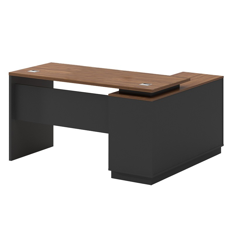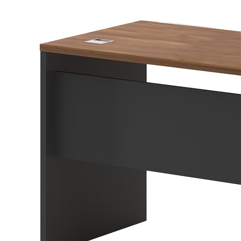 Γραφείο διεύθυνσης με ενσωματωμένο γωνιακό ερμάριο (στη αριστερή πλευρά), στον εντυπωσιακό χρωματισμό του καρυδί - ανθρακί. Κατασκευασμένο από υλικά υψηλών προδιαγραφών και σύμφωνα με τις εργονομικές απαιτήσεις του σήμερα.