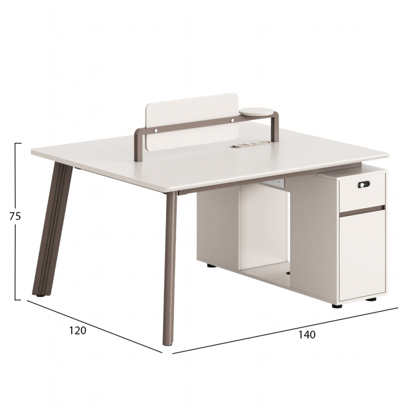 Σταθμός Εργασίας 2 Θέσεων NEWLINE ________________________________________ • Σύγχρονος σταθμός εργασίας 2 θέσεων, ιδανικός για οργανωμένους και αποδοτικούς επαγγελματικούς χώρους. • Μελαμίνη σε κρεμ απόχρωση που προσφέρει φωτεινή και ουδέτερη αισθητική και πόδια αλουμινίου σε ανοιχτό καφέ. ________________________________________ Υλικά: •Κατασκευή από μελαμίνη υψηλής ποιότητας •Πόδια από αλουμίνιο •Ανθεκτικά υλικά για καθημερινή επαγγελματική χρήση ________________________________________ Τι μας αρέσει: •Σταθμός/Γραφείο 2 θέσεων με ενιαία και λειτουργική διάταξη •Έτοιμη εγκατάσταση με πρίζες στο κάτω μέρος •Συρτάρια με κλειδαριά και ντουλάπια για οργάνωση της εργασίας •Ιδανικός για open space γραφεία και εταιρικά περιβάλλοντα ________________________________________ Συντήρηση: •Καθαρισμός επιφανειών με μαλακό, ελαφρώς νωπό πανί •Αποφυγή έντονης υγρασίας και λειαντικών υλικών ________________________________________ Διαστάσεις: •120x140x75Υ εκ.