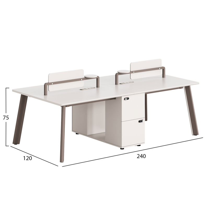 Σταθμός Εργασίας 4 Θέσεων NEWLINE ________________________________________ • Σύγχρονος σταθμός εργασίας 4 θέσεων, ιδανικός για οργανωμένους και αποδοτικούς επαγγελματικούς χώρους. • Μελαμίνη σε κρεμ απόχρωση που προσφέρει φωτεινή και ουδέτερη αισθητική και πόδια αλουμινίου σε ανοιχτό καφέ. ________________________________________ Υλικά: •Κατασκευή από μελαμίνη υψηλής ποιότητας •Πόδια από αλουμίνιο •Ανθεκτικά υλικά για καθημερινή επαγγελματική χρήση ________________________________________ Τι μας αρέσει: •Σταθμός Εργασίας 4 θέσεων με ενιαία και λειτουργική διάταξη •Έτοιμη εγκατάσταση με πρίζες στο κάτω μέρος •Συρτάρια με κλειδαριά και ντουλάπια για οργάνωση της εργασίας •Ιδανικός για open space γραφεία και εταιρικά περιβάλλοντα ________________________________________ Συντήρηση: •Καθαρισμός επιφανειών με μαλακό, ελαφρώς νωπό πανί •Αποφυγή έντονης υγρασίας και λειαντικών υλικών ________________________________________ Διαστάσεις: •120x240x75Υ εκ.