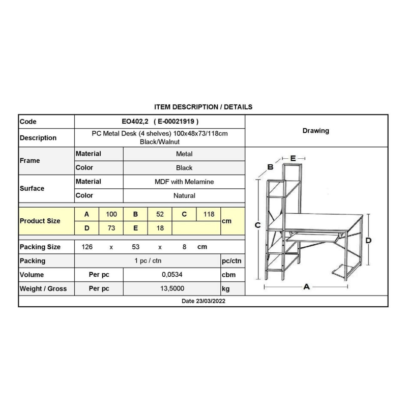 ΕΟ402,2 ΓΡΑΦΕΙΟ Η/Υ (4 ράφια) 100x48x73/118cm Μεταλ.Μαύρο/Φυσικό