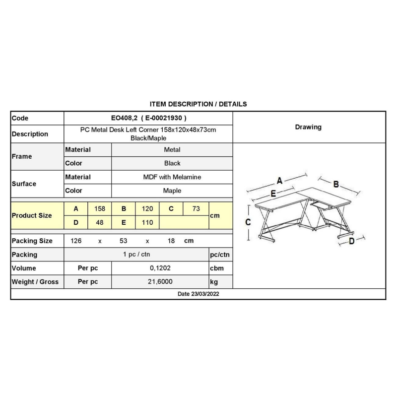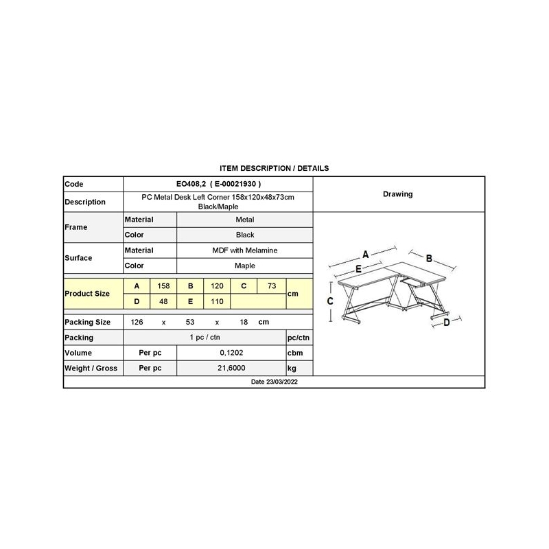 ΕΟ408,2 ΓΡΑΦΕΙΟ Η/Υ Γωνία 158x120x48x73cm Μεταλ.Μαύρο/Maple