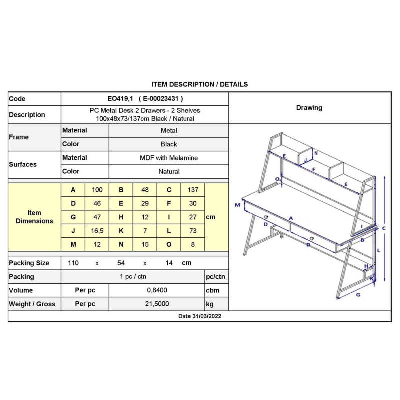 ΓΡΑΦΕΙΟ Η/Υ 2 Συρτάρια 2 Ράφια Μέταλλο Βαφή Μαύρο, MDF - Melamine Απόχρωση Φυσικό 100x48x73/137cm