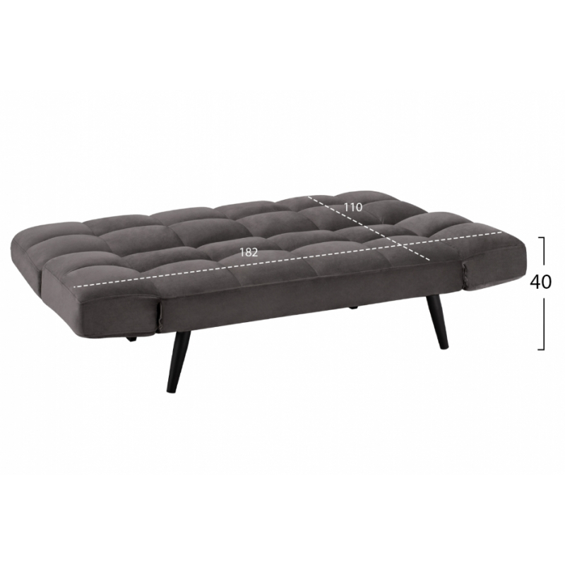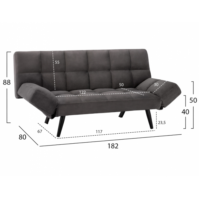 Καναπές τριθέσιος, επενδεδυμένος με βελούδινο ύφασμα σε γκρι απόχρωση 182Χ80Χ88Υ εκ. Πτυσσόμενος καναπές-κρεβάτι κατάλληλος για το καθιστικό ή το δωμάτιό σας,η πλάτη του, έχει την δυνατότητα να πέφτει πίσω και να μετατρέπεται εύκολα σε ένα άνετο κρεβάτι ή να παραμένει σε ανάκλιση, ενώ τα μπράτσα του είναι αναδιπλούμενα. Αν αναζητάτε στα έπιπλά σας την άνεση και την λειτουργικότητα, το συγκεκριμένο προϊόν θα σας εξασφαλίσει και τα δύο. Ο πολυχρηστικός αυτός καναπές είναι ιδανικός για απρόσμενους επισκέπτες σε περίπτωση διανυκτεύρευσης, παρέχοντας παράλληλα άνετο χώρο καθίσματος. Διαθέτει ενισχυμένα μεταλλικά πόδια, σε μαύρη απόχρωση και είναι ιδιαίτερα σταθερός και ανθεκτικός. Αποτελεί ιδανική επιλογή για εσάς που αναζητάτε κάτι κομψό, λειτουργικό και ποιοτικό. Διαστάσεις: 182x80x88 εκ. Ύψος καθίσματος: 40 εκ. Διαστάσεις καθίσματος: 122-182x50 εκ. Ύψος μπράτσου: 50-59 εκ. Διαστάσεις μπράτσου: 53x30 εκ. Απόσταση ποδιών: 117x67 εκ. Ύψος ποδιών: 23,5 εκ. Κρεβάτι: 182x110x40 εκ. Διαστάσεις πλάτης: 182x55 εκ.