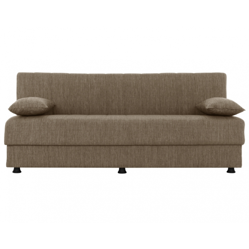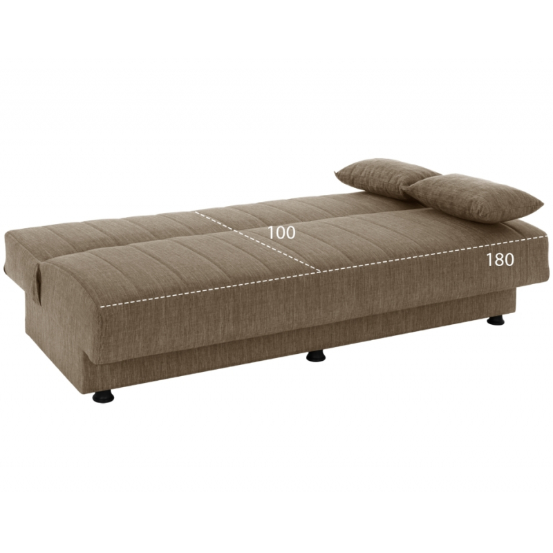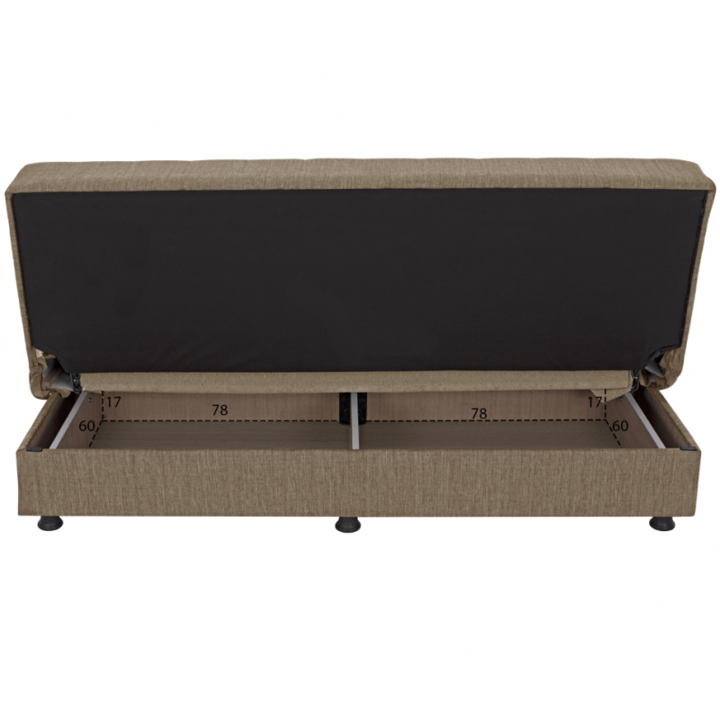 Σας παρουσιάζουμε έναν καινούριο, τριθέσιο καναπέ-κρεβάτι. Έναν καναπέ υψηλής ποιότητας και ιδιαιτέρως πρακτικό, που θα ενθουσιάσει τόσο τον ιδιοκτήτη του, όσο και τους επισκέπτες του! Ξεκινώντας από τα βασικά και τα προφανή, το χρώμα της επένδυσης με το εξαιρετικό και καλοραμμένο ανάγλυφο ύφασμα αυτού του καναπέ, είναι καφέ. Διαθέτει 2 μικρά μακρόστενα μαξιλάρια με το ίδιο ύφασμα που μπορούν να χρησιμοποιηθούν όπως θέλει ο καθένας. Χαρακτηριστικό αυτού του καναπέ είναι ότι δεν διαθέτει μπράτσα με αποτέλεσμα να μην περιορίζει την χρήση του από τους χρήστες του. Επίσης, γίνεται πολύ εύκολα κρεβάτι μέσω ενός εύχρηστου μηχανισμού (κλικ-κλακ) πολλαπλασιάζοντας την χρησιμότητά του. Κάτω από το κάθισμα του καναπέ υπάρχουν 2 αποθηκευτικοί χώροι με ενισχυμένο πάτωμα καθιστώντας τον ένα πραγματικό πολυεργαλείο, ειδικά για φοιτητικά σπίτια αλλά και σπίτια με περιορισμένο γενικά χώρο. ΔΙΑΣΤΑΣΕΙΣ: Γενικές Διαστάσεις: 180x72x77 εκ. Διαστάσεις καθίσματος: 180x56 εκ. Ύψος καθίσματος: 40 εκ. Διαστάσεις πλάτης: 180x40 εκ. Διαστάσεις Κρεβατιού: 180x100 εκ. Αποθηκευτικός χώρος: 78x60x17 εκ. (x2) Διαστάσεις μαξιλαριών: 48x28x17 εκ. ΥΛΙΚΑ ΚΑΤΑΣΚΕΥΗΣ: Ο σκελετός του καναπέ είναι κατασκευασμένος από ξύλο. Τα πόδια του καναπέ είναι χαμηλά, στρογγυλά και φτιαγμένα από ενισχυμένο πολυαιθυλένιο με εξαιρετική αντοχή στο βάρος και στην υγρασία. Το ύφασμα που καλύπτει ολόκληρο τον καναπέ, τώρα, είναι εξαιρετικής ποιότητας και καλοραμμένο επάνω στο μέτριας σκληρότητας αφρώδες υλικό του καθίσματος αλλά και της πλάτης που είναι ίδιας πυκνότητας και πάχους μιας και ο καναπές γίνεται και κρεβάτι. ΣΥΝΤΗΡΗΣΗ: Τα ποιοτικά υλικά κατασκευής του καναπέ, τον καθιστούν εξαιρετικά φιλικό προς τον χρήστη! Ένα ξεσκόνισμα κι ένα πέρασμα με ένα υγρό πανάκι σε όλη την επιφάνειά του, θα τον φρεσκάρει και θα τον διατηρήσει σαν καινούριο για πολλά χρόνια. ΠΛΕΟΝΕΚΤΗΜΑΤΑ: Αυτός ο καναπές είναι ένα πραγματικό πολυεργαλείο. Προσφέρει όλα εκείνα τα χαρακτηριστικά που τον κάνουν να ξεχωρίζει την κατηγορία του. Έχει