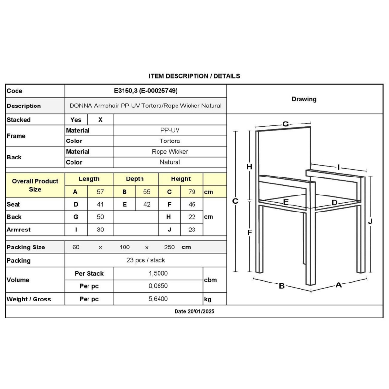 DONNA Πολυθρόνα-Pro Στοιβαζόμενη, PP-UV Tortora, Rope Wicker Φυσικό 57x55x79cm