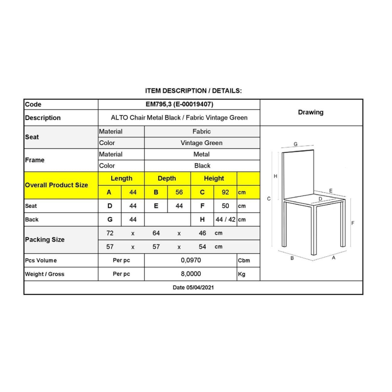 ALTO Καρέκλα Μέταλλο Βαφή Μαύρο, Ύφασμα Vintage Green 44x56x92cm
