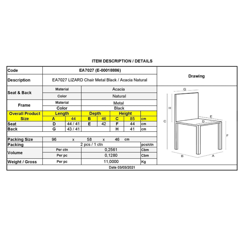ΕΑ7027 - LIZARD Καρέκλα Ακακία Φυσικό/Μεταλ.Μαύρο