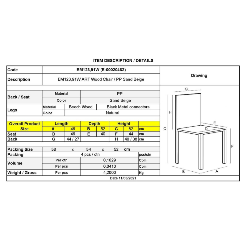 ΕΜ123,91W ART Wood Καρέκλα PP Sand Beige