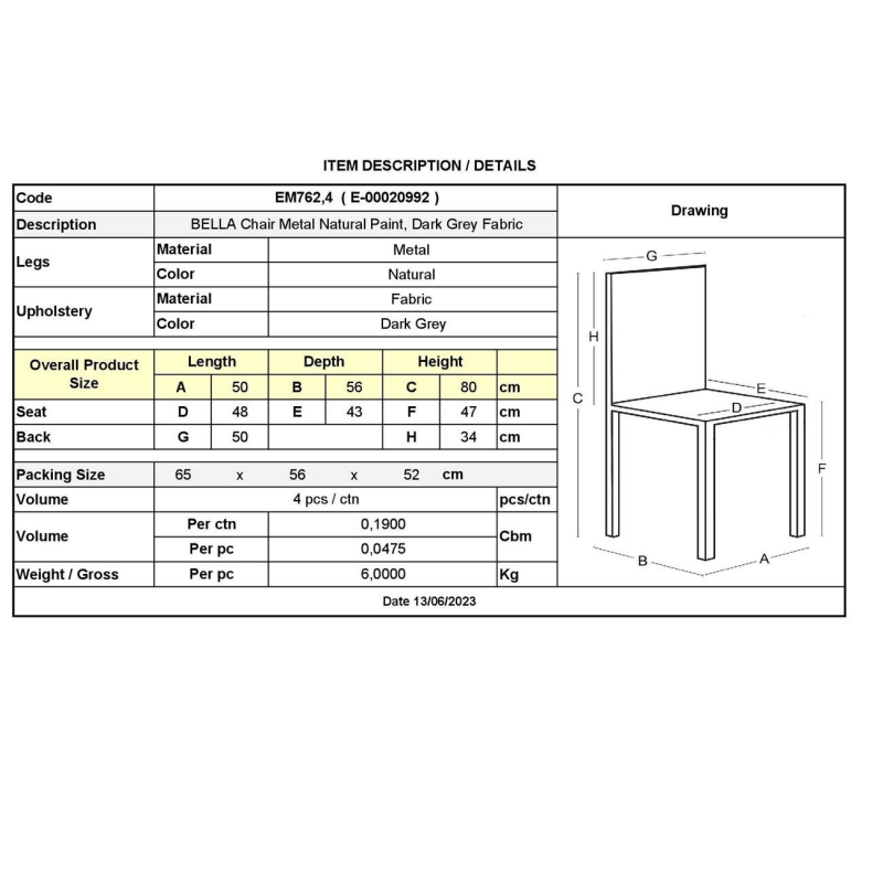 BELLA Καρέκλα Τραπεζαρίας, Μέταλλο Βαφή Φυσικό, Ύφασμα Απόχρωση Γκρι 50x56x80cm
