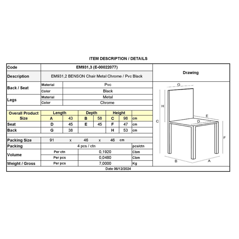 BENSON Καρέκλα Μέταλλο Χρώμιο, PVC Μαύρο 43x58x98cm