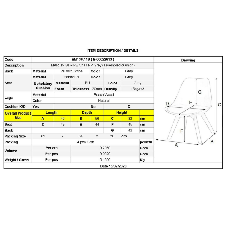 ΕΜ136,44S MARTIN STRIPE Καρέκλα PP Γκρι (Ξύλινο πόδι-Μοντ/νη ταπετσαρία)