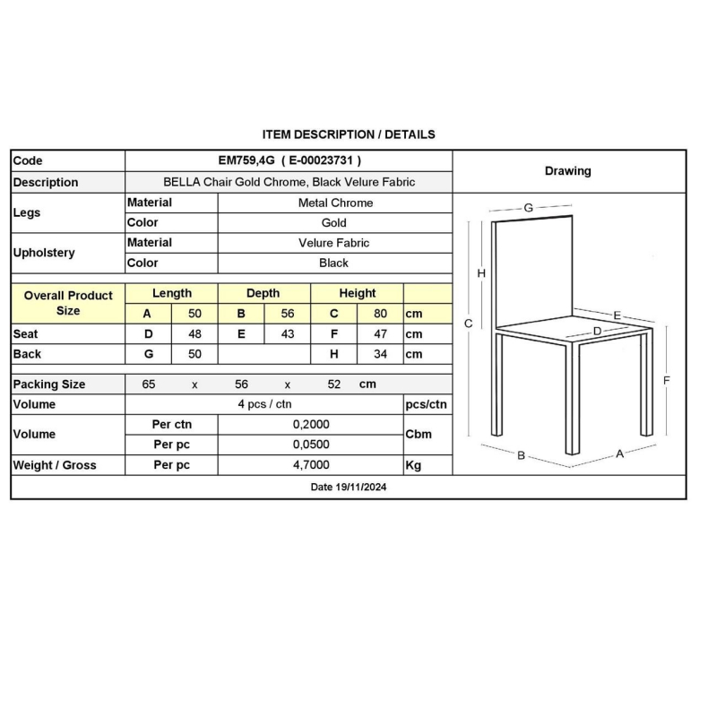 ΕΜ759,4G BELLA Καρέκλα Χρώμιο Χρυσό/Ύφασμα Velure Μαύρο
