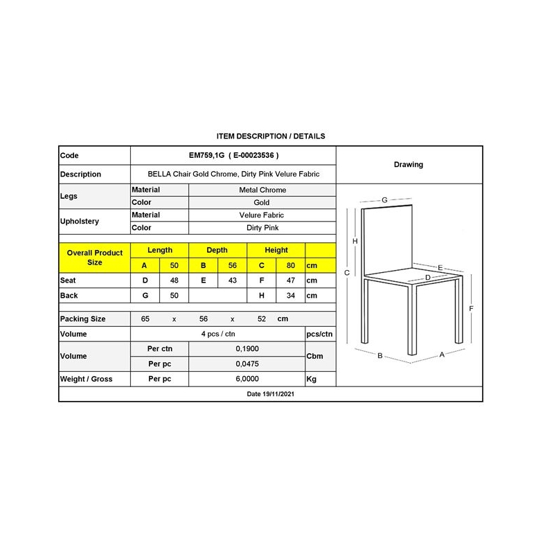ΕΜ759,1G BELLA Καρέκλα Χρώμιο Χρυσό/Ύφασμα Velure Dirty Pink