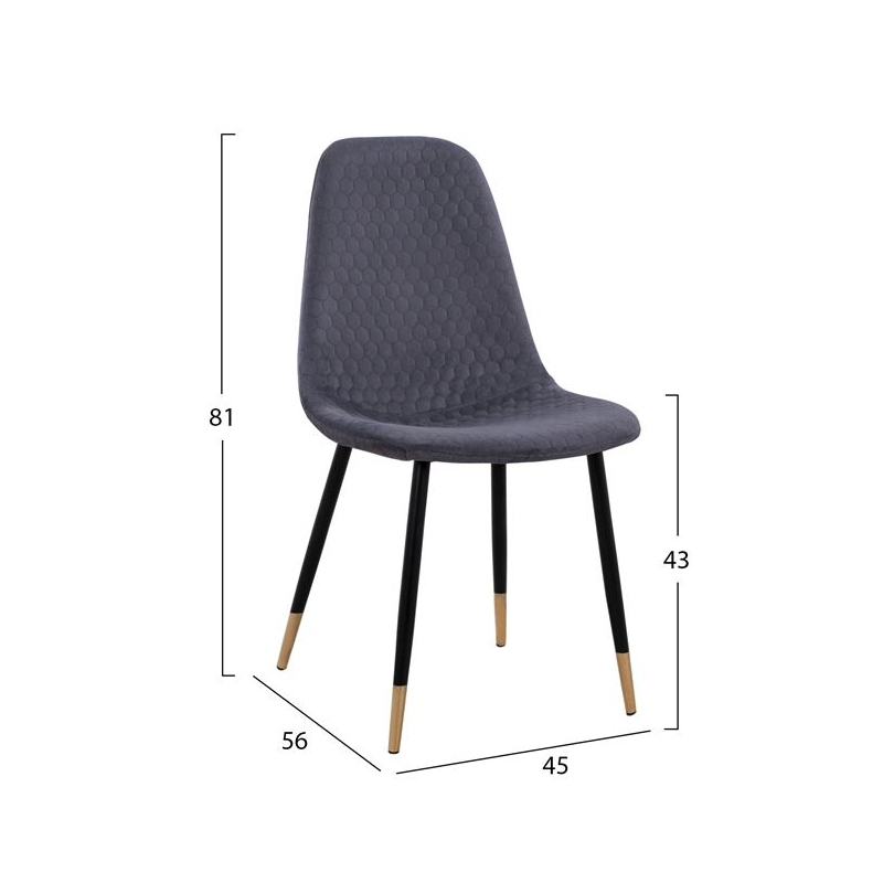 Η καρέκλα LUCILLE είναι επενδυμένη με ύφασμα βελούδο σε γκρι απόχρωση με μεταλλικό σκελετό σε μαύρη ματ απόχρωση και χρυσές λεπτομερείς. Σε όποιο δωμάτιο κι αν την βάλει κανείς, θα βρουν τη χρησιμότητά τους. Πρόκειται για καρέκλα με ιδιαίτερη αισθητική και σχεδιασμό που γίνεται κομμάτι της διακόσμησης. Ένα άγγιγμα κομψότητας, σε συνδυασμό με αμέτρητες χρωματικές παραλλαγές και σχήματα. Το ελαφρώς λαμπερό ύφασμα με την αδιαμφισβήτητη εμφάνιση και αίσθηση δεν είναι χωρίς λόγο μια από τις ζωντανές τάσεις κατ 'εξοχήν. Η βελούδινη κάλυψη κάνει τη διαφορά! Διαστάσεις: 45x56x81 εκ. Ύψος καθίσματος: 43 εκ. Διαστάσεις καθίσματος: 38x44 εκ.