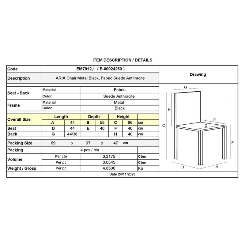 ΕΜ7912,1 ARIA Καρέκλα Μέταλ.Μαύρο/Ύφασμα Suede Ανθρακί