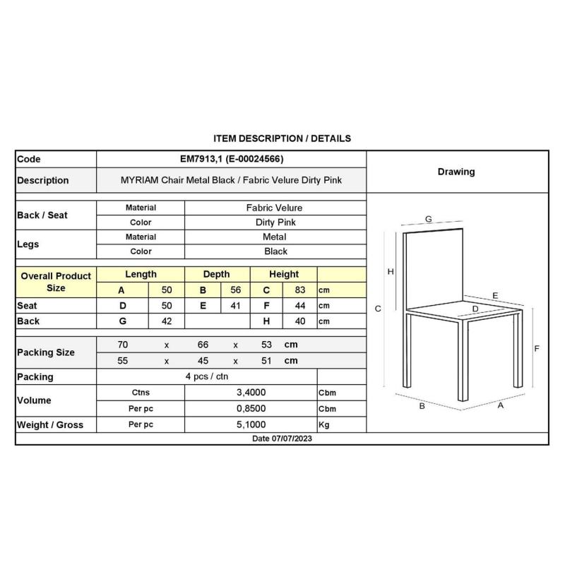 ΕΜ7913,1 MYRIAM Καρέκλα Μέταλο Μαύρο - Ύφασμα Velure Dirty Pink