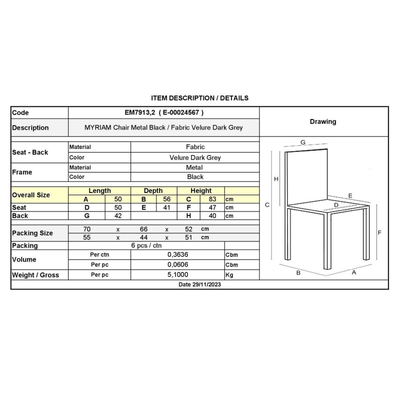 MYRIAM Καρέκλα Τραπεζαρίας, Μέταλλο Βαφή Μαύρο, Ύφασμα Velure Σκούρο Γκρι ( Συσκ.6 ) 50x56x83cm
