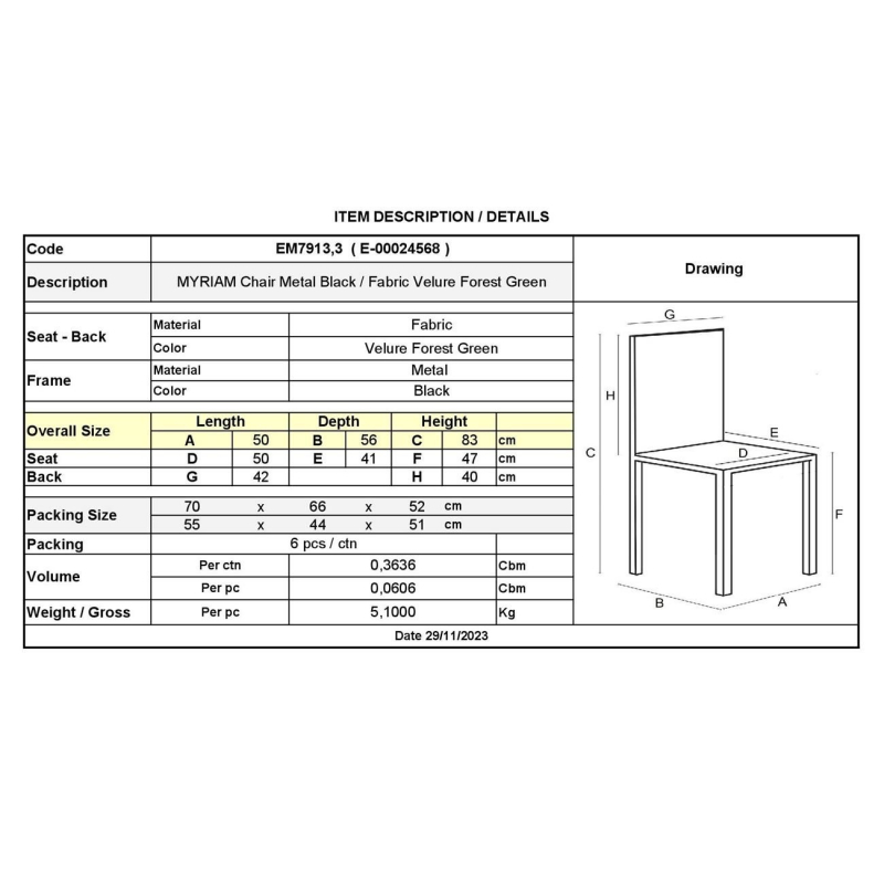 MYRIAM Καρέκλα Τραπεζαρίας, Μέταλλο Βαφή Μαύρο, Ύφασμα Velure Forest Green ( Συσκ.6 ) 50x56x83cm