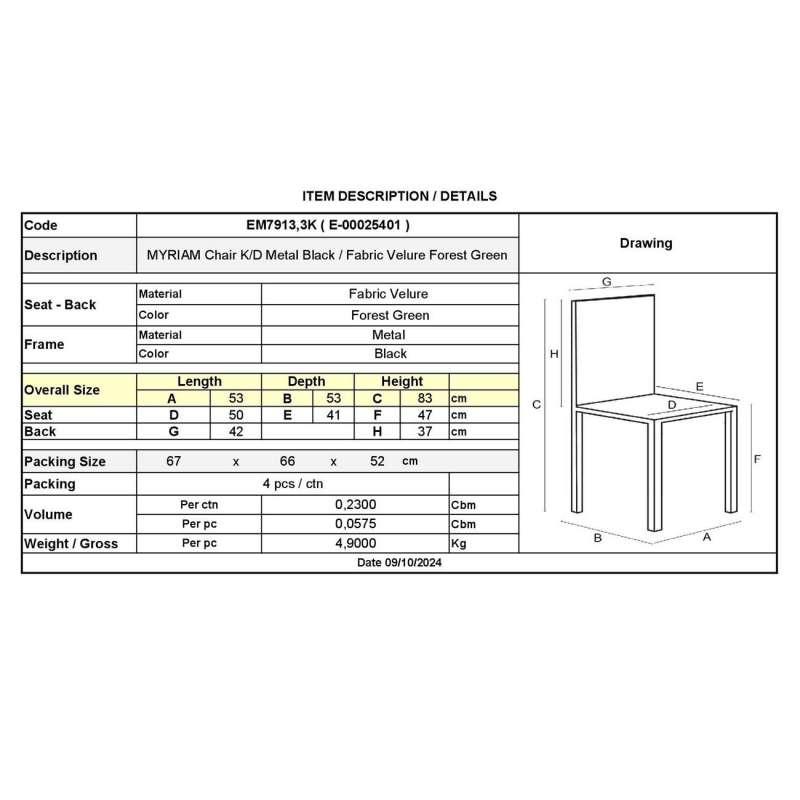 MYRIAM K/D Καρέκλα Τραπεζαρίας Μέταλλο Βαφή Μαύρο, Ύφασμα Velure Forest Green ( Συσκ.4 ) 50x56x83cm