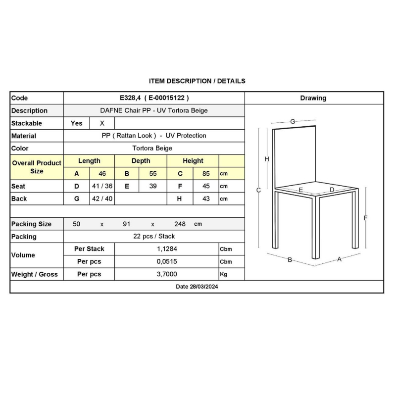 DAFNE Καρέκλα Τραπεζαρίας Κήπου Στοιβαζόμενη, PP Rattan Look UV Protection, Tortora 46x55x85cm