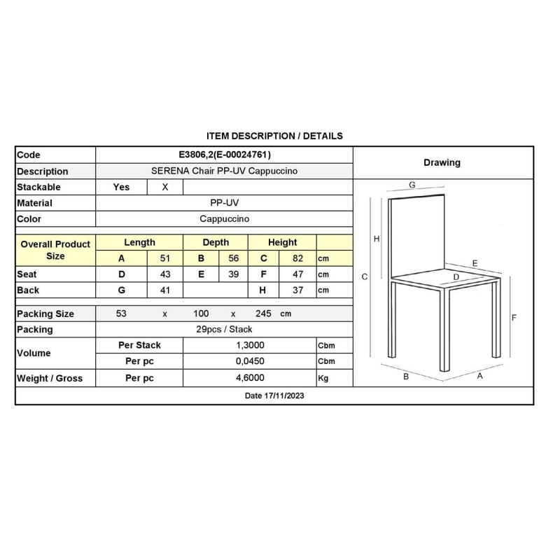 SERENA Καρέκλα, Στοιβαζόμενη PP - UV Cappuccino 51x56x82cm