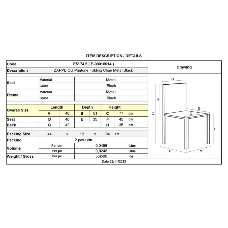Ε5174,5 ΖΑΠΠΕΙΟΥ Pantone Καρέκλα Πτυσ/νη Μέταλλο Μαύρο