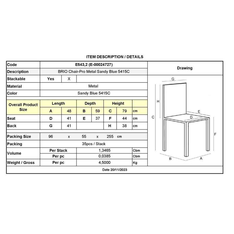 BRIO Καρέκλα-Pro Στοιβαζόμενη Μέταλλο Βαφή Sandy Blue 5415C 48x59x79cm