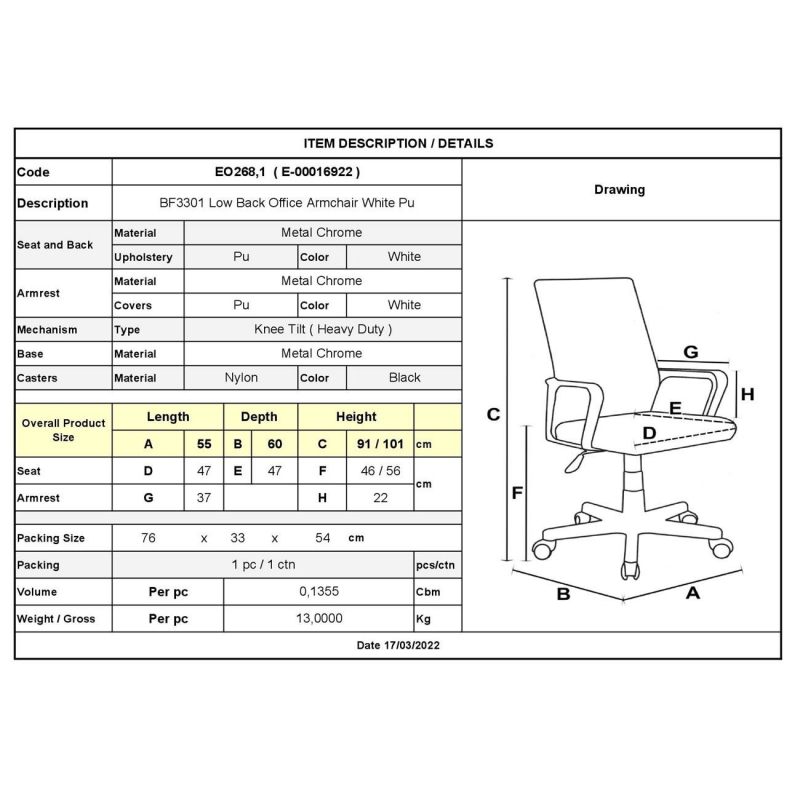 BF3301 Πολυθρόνα Γραφείου Μέταλλο Βάση Χρώμιο, PU Άσπρο 55x60x91/101cm