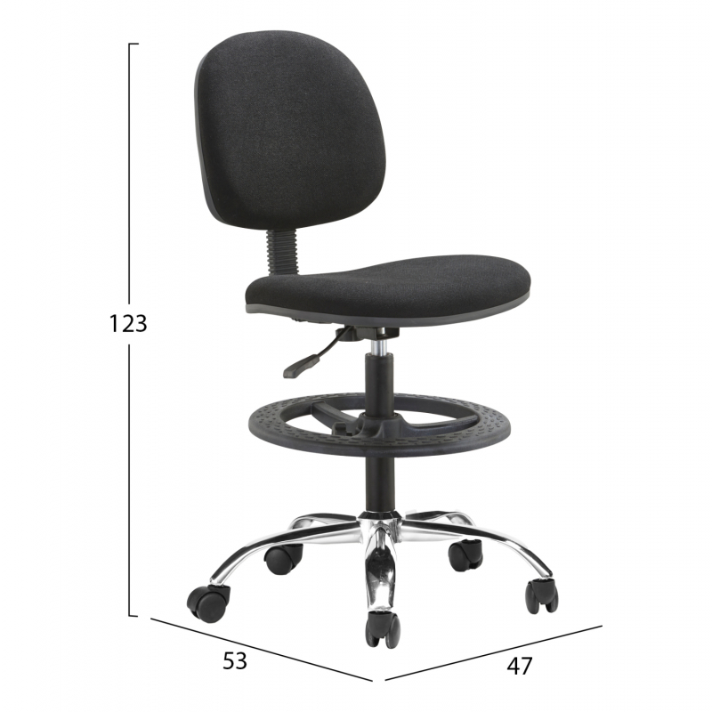 Η υπερυψωμένη καρέκλα εργασίας (σκαμπό) DROMEN είναι η ιδανική λύση για επαγγελματικούς χώρους που απαιτούν εργασία σε ψηλούς πάγκους, σχεδιαστήρια ή reception, προσφέροντας την απαραίτητη στήριξη χωρίς να θυσιάζει την ελευθερία κινήσεων. Διαστάσεις: 48x60x104Υ εκ. Min ύψος καρέκλας: 104 εκ. Max ύψος καρέκλας: 130 εκ. Διαστάσεις καθίσματος: 47x44 εκ. Διαστάσεις πλάτης: 38x35 εκ. Min ύψος καθίσματος: 62 εκ. Max ύψος καθίσματος: 88 εκ. ________________________________________ Ανάλυση Υλικών & Τεχνικά Χαρακτηριστικά: •Επένδυση: Υψηλής αντοχής μαύρο ύφασμα στο κάθισμα και την πλάτη, με πυκνή ύφανση που επιτρέπει τη διαπνοή και αντέχει στην καθημερινή τριβή. •Υποπόδιο (Footring): Ειδικό κυκλικό υποπόδιο από ενισχυμένο πολυπροπυλένιο, ρυθμιζόμενο καθ' ύψος, που προσφέρει σταθερότητα στα πόδια όταν η καρέκλα βρίσκεται σε πλήρη έκταση. •Μηχανισμός: Απλός και αξιόπιστος μηχανισμός ρύθμισης ύψους με μοχλό κάτω από το κάθισμα. •Ανάρτηση (Gas Lift): Ειδική υπερυψωμένη ανάρτηση 240mm, που επιτρέπει στην καρέκλα να φτάσει σε συνολικό ύψος έως 123 εκ. •Βάση & Ροδάκια: Μεταλλική βάση "αστέρι" (R300mm) με φινίρισμα χρωμίου για κομψή εμφάνιση και μαύρα ροδάκια πολυπροπυλενίου για εύκολη μετακίνηση. ________________________________________ Πλεονεκτήματα & Οφέλη: 1.Versatility (Πολυμορφικότητα): Σχεδιασμένη ειδικά για ψηλά γραφεία και πάγκους εργασίας, επιτρέποντας στον χρήστη να εργάζεται άνετα σε διαφορετικά επίπεδα ύψους. 2.Compact Design: Ο σχεδιασμός χωρίς μπράτσα επιτρέπει στην καρέκλα να αποθηκεύεται εύκολα κάτω από τον πάγκο, εξοικονομώντας πολύτιμο χώρο. 3.Εργονομικό Υποπόδιο: Μειώνει την πίεση στους μηρούς και τη μέση, προσφέροντας ένα σταθερό σημείο στήριξης για τα πόδια. 4.Ανθεκτικότητα: Η μεταλλική βάση σε συνδυασμό με το ανθεκτικό ύφασμα την καθιστούν μια αξιόπιστη επιλογή για "σκληρή" επαγγελματική χρήση. ________________________________________ Οδηγίες Συντήρησης: •Ύφασμα: Χρησιμοποιήστε ηλεκτρική σκούπα με το ειδικό εξάρτημα για την αφαίρεση σκόνης. Για λεκέδες, χρησιμοποιήστε ένα ελαφρώς νωπό πανί με ειδικό καθαριστικό υφασμάτων. •Βάση Χρωμίου: Σκουπίστε με ένα μαλακό πανί για να αφαιρέσετε δαχτυλιές και να διατηρήσετε τη γυαλάδα