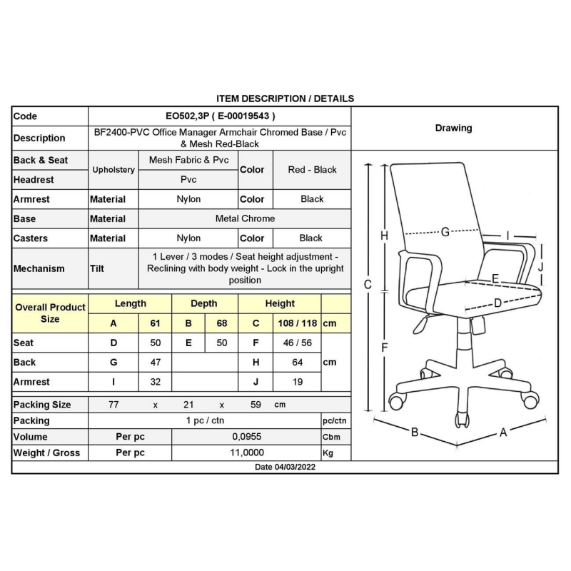 ΕΟ502,3P BF2400-PVC Πολυθρόνα Διευθυντή Χρώμιο/Pvc&Mesh Κόκκινο/Μαύρο