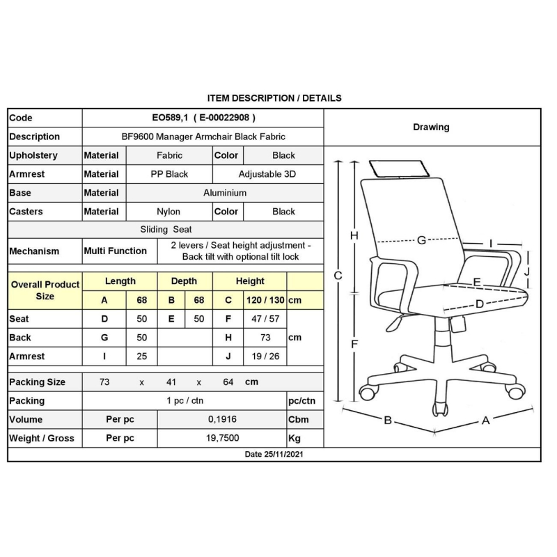 BF9600 Πολυθρόνα Γραφείου Διευθυντή, Βάση Αλουμινίου, Ύφασμα Μαύρο 68x68x120/130cm