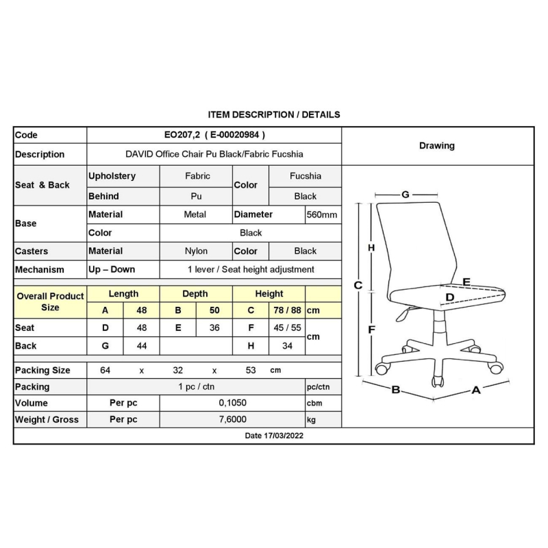 DAVID Καρέκλα Γραφείου PU Μαύρο, Ύφασμα Ροδί, Βάση Μέταλλο Βαφή Μαύρο 48x50x78/88cm