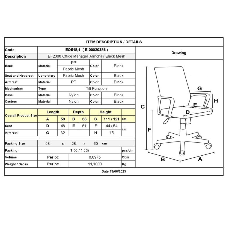 ΕΟ518,1 BF2008 Πολυθρόνα Διευθ.Μαύρο Mesh