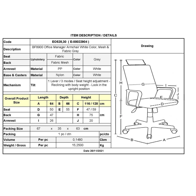 ΕΟ528,30 BF8900 Πολυθρόνα Διευθυντή Άσπρο / Mesh-Ύφασμα Γκρι