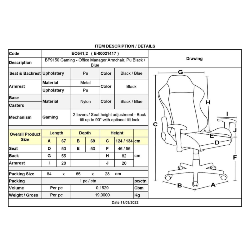 BF9150 Gaming Πολυθρόνα Γραφείου, Ανάκλιση Πλάτης έως 90°, Pu Μαύρο - Μπλε 67x69x124/134cm