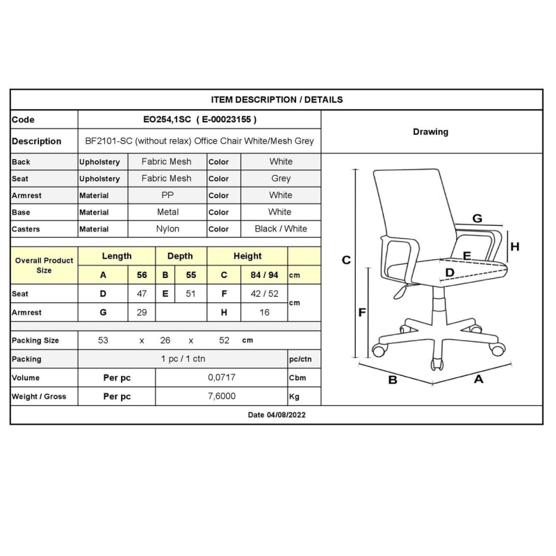 BF2101-SC Πολυθρόνα Γραφείου χωρίς Ανάκλιση Άσπρο - Mesh Γκρι 56x55x84/94cm
