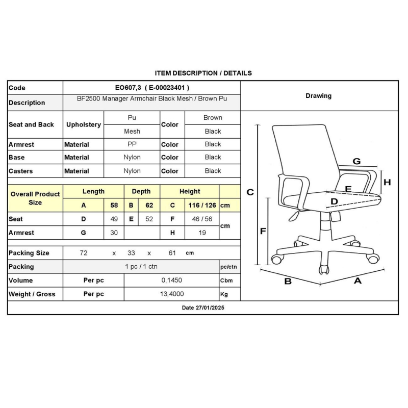 ΕΟ607,3 BF2500 Πολυθρόνα Διευθυντή Mesh Μαύρο - Pu Καφέ