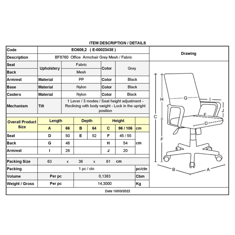 BF8760 Πολυθρόνα Γραφείου, Mesh Γκρι, Ύφασμα Γκρι 66x64x96/106cm
