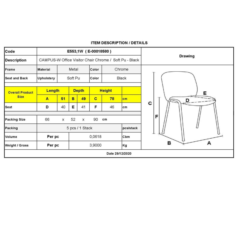 CAMPUS Καρέκλα Επισκέπτη Γραφείου, Στοιβαζόμενη Χρώμιο Μέταλλο, Soft Pu Μαύρο 51x49x78cm