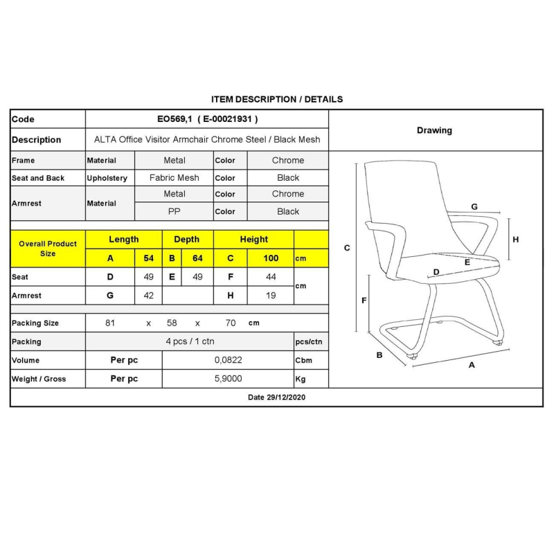 ALTA Πολυθρόνα Γραφείου Επισκέπτη Χρώμιο, Mesh Μαύρο 54x64x100cm