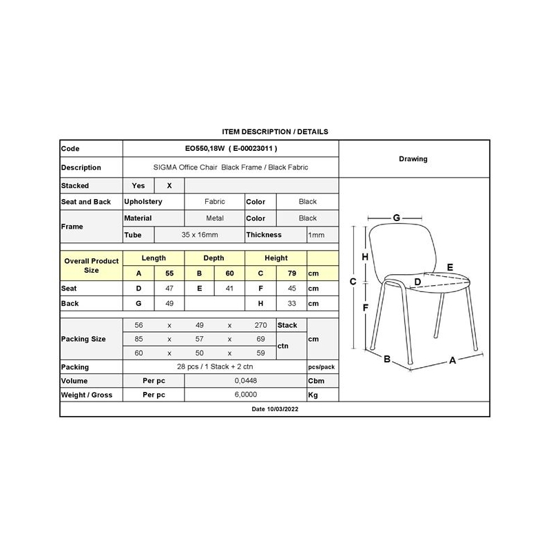 SIGMA Καρέκλα Στοιβαζόμενη Γραφείου Επισκέπτη, Μέταλλο Βαφή Μαύρο, Ύφασμα Μαύρο 55x60x79cm / Σωλ.35x16/1mm