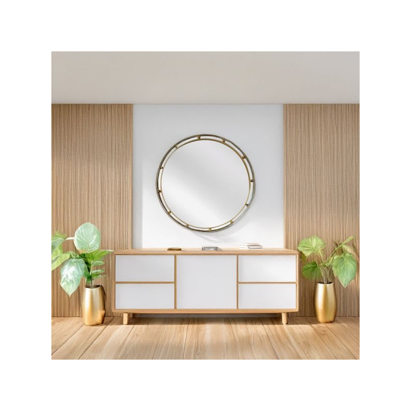 Λεπτομέρειες Ο χρυσός μεταλλικός στρογγυλός καθρέπτης τοίχου προσδίδει πολυτέλεια και λάμψη σε κάθε εσωτερικό χώρο, χάρη στο κομψό πλαίσιο του με γεωμετρικά στοιχεία. Το μεταλλικό περίγραμμα με τις χρυσές σφαίρες δημιουργεί μια εκλεπτυσμένη διακοσμητική πρόταση που ενισχύει τη φωτεινότητα και το στυλ ενός δωματίου. Είναι ιδανικός για glam, art deco ή κλασικούς χώρους, ενώ τοποθετείται άψογα πάνω από κονσόλα, τζάκι ή στο υπνοδωμάτιο. Συνδυάζεται υπέροχα με γήινες αποχρώσεις, μαρμάρινα στοιχεία και διακοσμητικά από μέταλλο ή γυαλί, δημιουργώντας μια ολοκληρωμένη εικόνα με άποψη και φινέτσα.