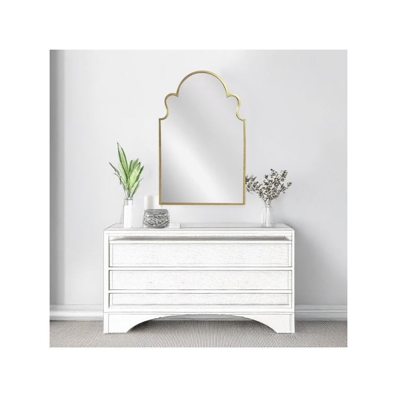 Ο χρυσός μεταλλικός καθρέπτης τοίχου με το ιδιαίτερο, συμμετρικό σχήμα αποτελεί μια εκλεπτυσμένη πρόταση που συνδυάζει γεωμετρική κομψότητα με πολυτελές φινίρισμα. Η μεταλλική του κατασκευή προσφέρει στιβαρότητα και ανθεκτικότητα, ενώ το λεπτό επιχρυσωμένο πλαίσιο τον καθιστά ιδανικό για κλασικούς και σύγχρονους χώρους. Το μοναδικό του σχήμα τραβάει το βλέμμα και μετατρέπει τον καθρέπτη σε διακοσμητικό στοιχείο υψηλής αισθητικής. Τοποθετήστε τον σε είσοδο, υπνοδωμάτιο ή καθιστικό για να προσθέσετε φως, βάθος και έναν αέρα αρχιτεκτονικής ισορροπίας στον χώρο. Συνδυάζεται άψογα με φυσικά υλικά όπως ξύλο και λινό για ένα elegant αποτέλεσμα.
