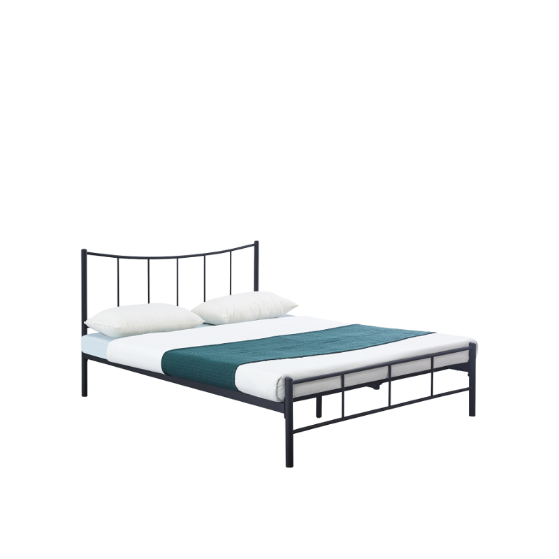 Μεταλλικό διπλό κρεβάτι σε μαύρο χρώμα με διακοσμητικά μοτίβα και προσκέφαλο με καμπύλη. Διαθέτει μεταλλικό περιμετρικό σκελετό με μοντέρνα σχέδια. Συμπεριλαμβάνονται ορθοπεδικές τάβλες. Είναι ένα διαχρονικό κρεβάτι που χρησιμοποιείται σε μοντέρνους χώρους.