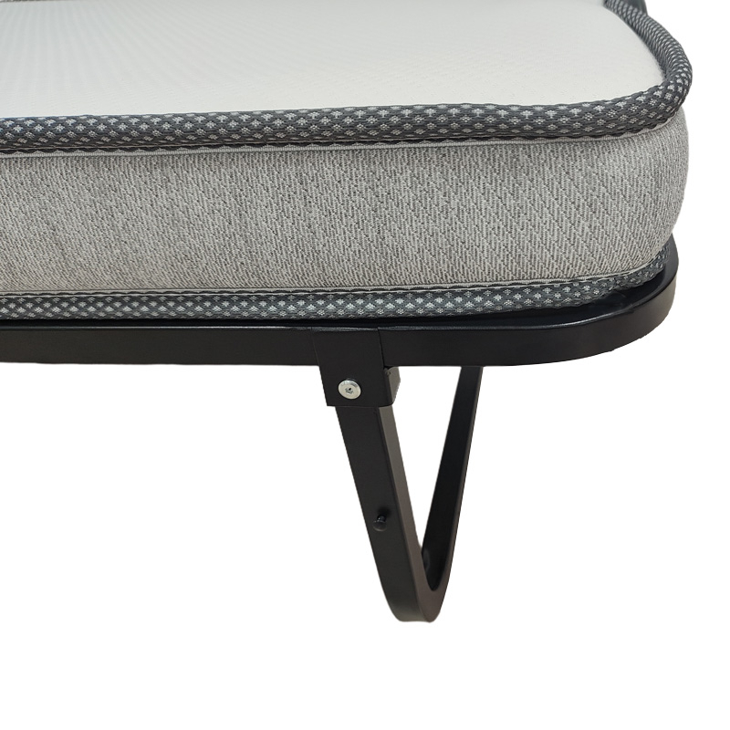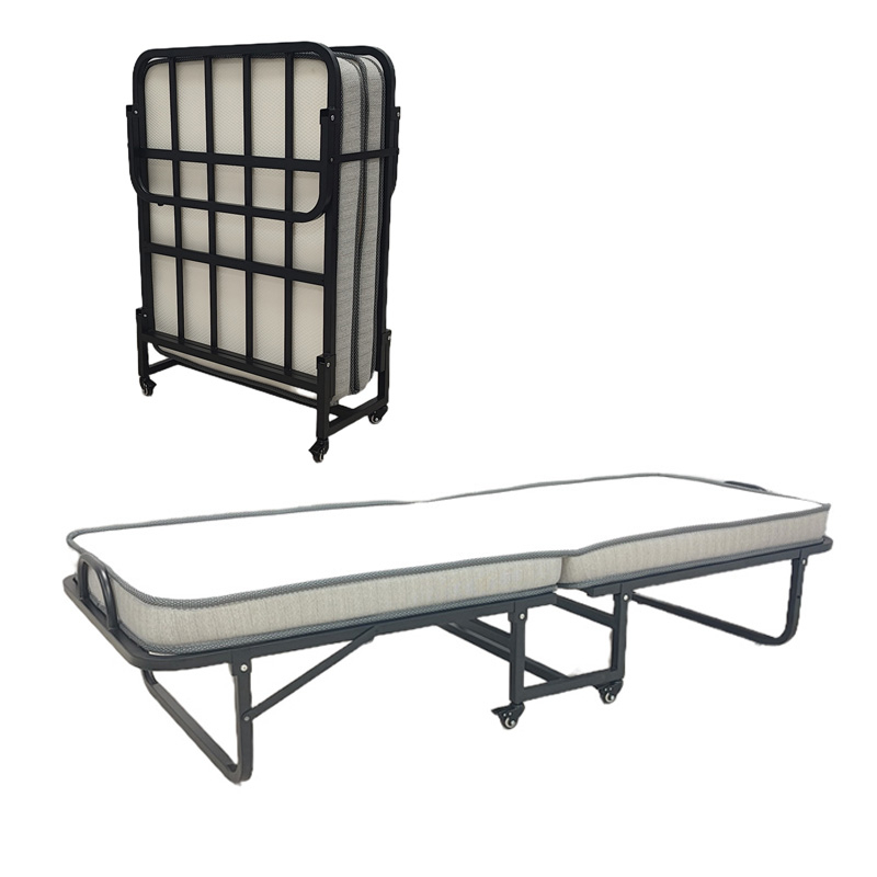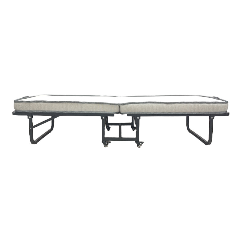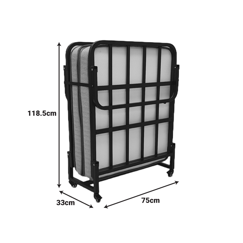 Το κρεβάτι συνοδεύεται από ένα άνετο στρώμα, το οποίο διπλώνει αρμονικά μαζί με τον σκελετό, μειώνοντας στο ελάχιστο τον απαιτούμενο χώρο. Οι ενσωματωμένες ρόδες κάτω από τη βάση παρέχουν απαράμιλλη ευκολία στη μετακίνηση, καθιστώντας το προϊόν ιδανικό για γρήγορες αλλαγές διάταξης στο χώρο ή για αποθήκευση σε ντουλάπες και αποθήκες.