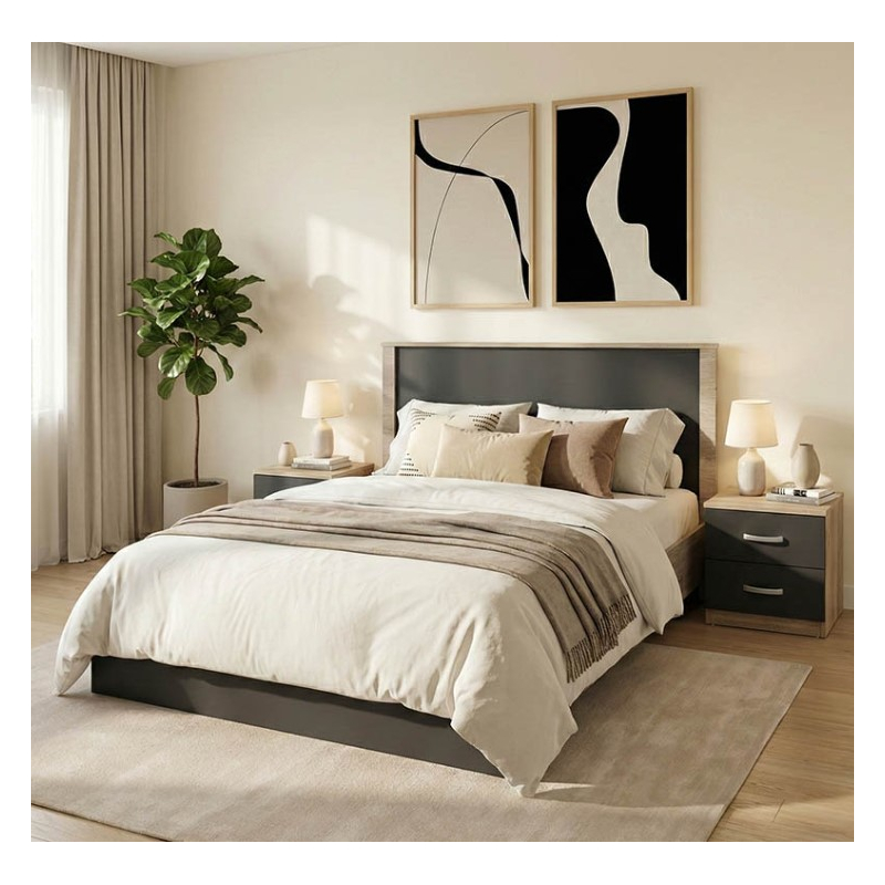 Ανανεώστε τον προσωπικό σας χώρο με ένα σετ κρεβατοκάμαρας που συνδυάζει την απαράμιλλη αισθητική του με τις καθαρές γραμμές του σύγχρονου design. Σχεδιασμένο για να προσφέρει ηρεμία και λειτουργικότητα, το σετ Athos αποτελεί την ιδανική επιλογή για κάθε μοντέρνο σπίτι. Τεχνικά χαρακτηριστικά κρεβατιού: Σταθερός σκελετός από υψηλής ποιότητας μοριοσανίδα με αντοχή στη φθορά και στο χρόνο. Φέρει ξύλινες τάβλες που εφάπτουν ακριβώς στο μέγεθος του κρεβατιού και θα σας προσφέρουν ξεκούραστο ύπνο. Κατάλληλο για στρώμα διαστάσεων 140x200 εκ. (δεν περιλαμβάνεται στη τιμή) Προσφέρεται σε υπέροχη διχρωμία sonoma- ανθρακί Διαστάσεις προϊόντος: Μήκος: 150 εκ Πλάτος: 206.5 εκ Υψος: 96 εκ Τεχνικά χαρακτηριστικά κομοδίνο: Σταθερός σκελετός από υψηλής ποιότητας μοριοσανίδα με αντοχή στη φθορά και στο χρόνο. Φέρει δύο συρόμενα συρτάρια αποθήκευσης. Προσφέρεται σε μια υπέροχη διχρωμία sonoma- ανθρακί Διάσταση προϊόντος: Μήκος: 48 εκ. Πλάτος: 40 εκ. Ύψος: 41,5 εκ.